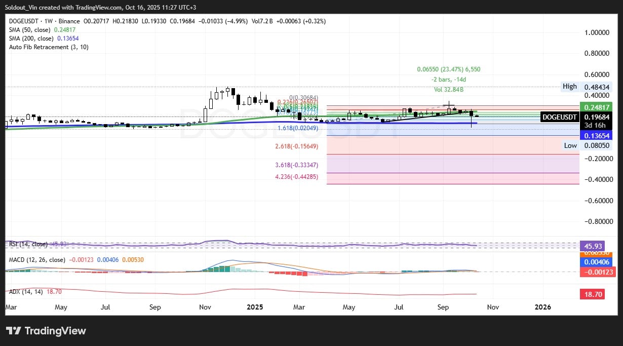 Looking at the Dogecoin weekly chart, the price is at $0.19684, slightly below the 50-week simple moving average (SMA) of $0.24817, which is now acting as strong resistance. The key support is the 200-week SMA at $0.13654, which lines up with a broader horizontal demand zone.