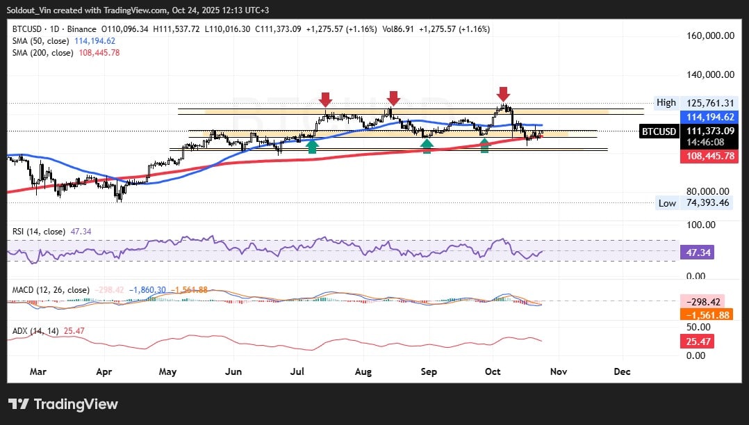 The chart also shows clear horizontal support and resistance zones. Sellers have repeatedly pushed Bitcoin down from the $125,000–$126,000 area, as marked by red arrows. On the downside, strong support can be found just above $108,000 and around $105,000, close to the 200-day SMA.