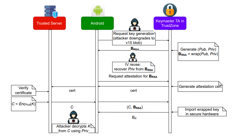 For instance, in Samsung’s TrustZone Operating System, a keymaster AES-GCM IV-reuse attack was discovered in 2022, which allowed protected key extraction and abuse of attestation. Furthermore, an attacker who has already compromised the app process or the kernel will likely be able to encrypt and decrypt content, but won’t be able to extract the private key itself.