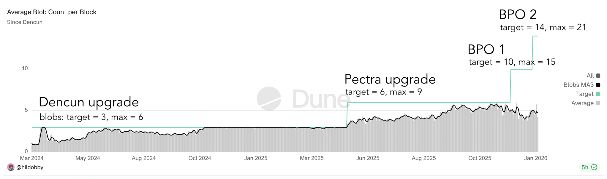Blob Parameter Only forks are now a reality – Ethereum now can and has already increased the blob count without having to wait through an entire fork cycle, scaling as needed for L2 usage. The first two BPO forks were stress-tested successfully and baked into Fusaka, with the first going live a few days after Fusaka and the second in the beginning of January. Ethereum now targets 14 blobs per block and allows a maximum of 21 – a 2.3x increase for L2 data space compared to pre-Fusaka!
